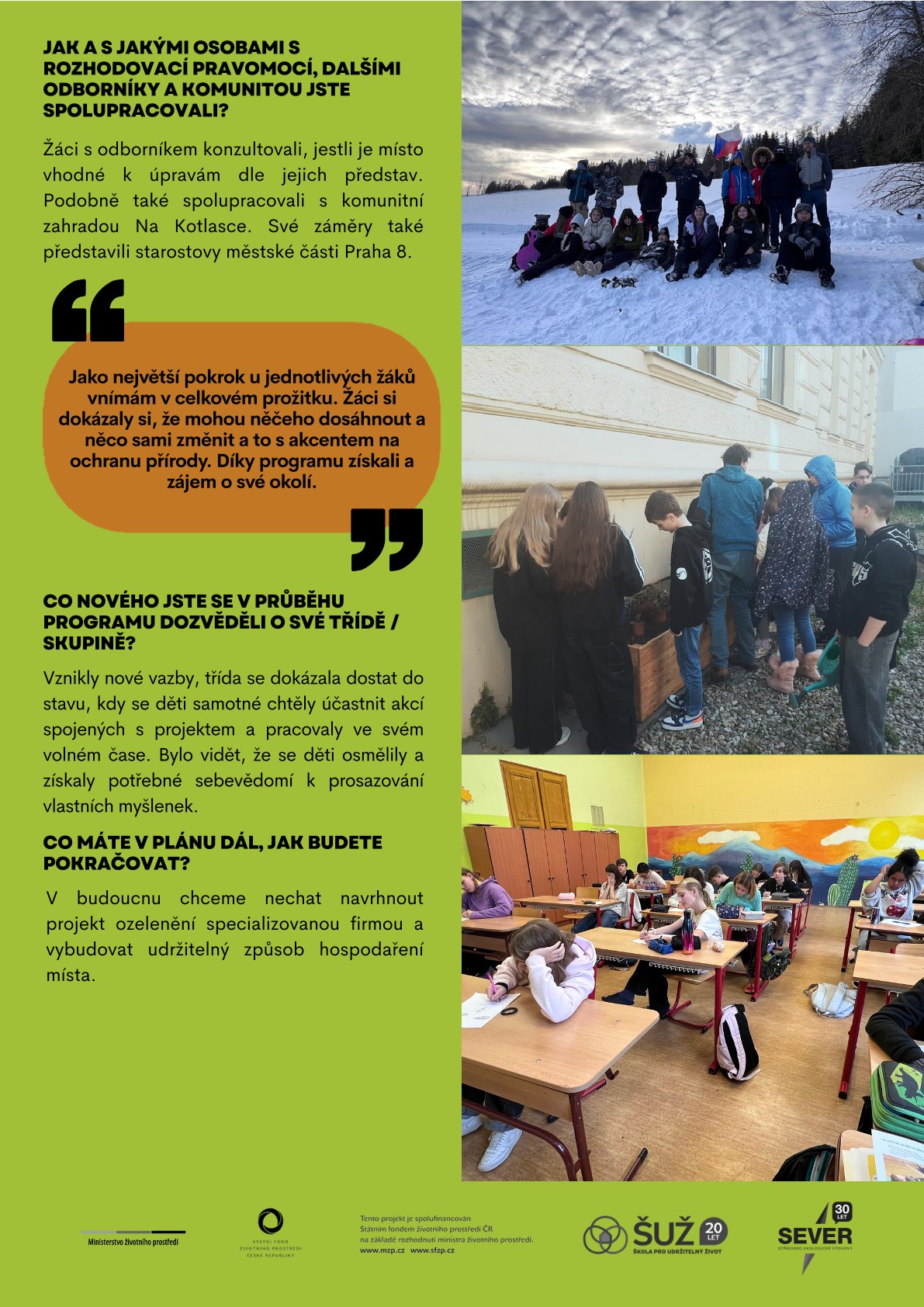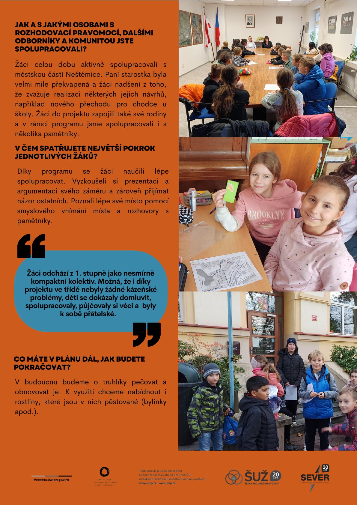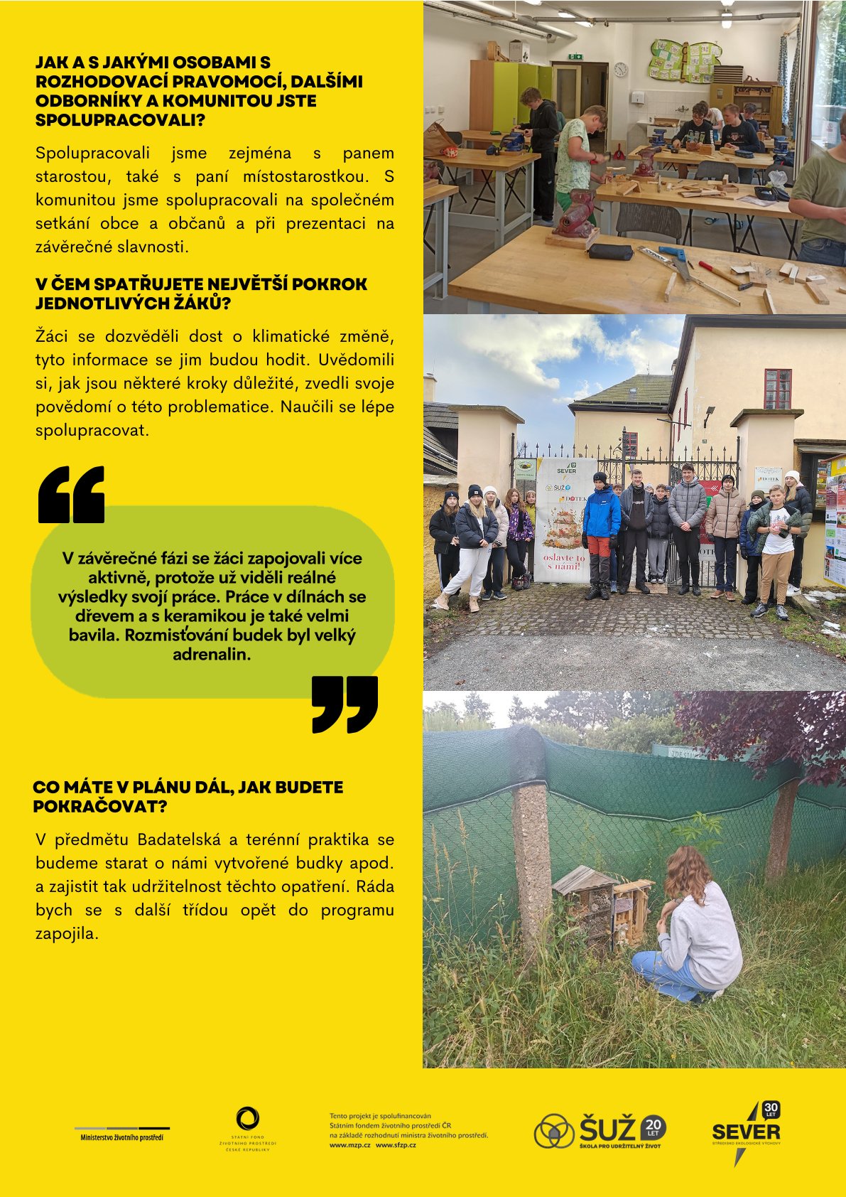 Na jaký problém v obci či okolí školy se žáci zaměřili? Jak program Škola pro udržitelný život v zapojených školách proběhl? Co žáci v rámci programu vytvořili? Nebo v čem spatřují největší pokrok a co plánují do budoucna?