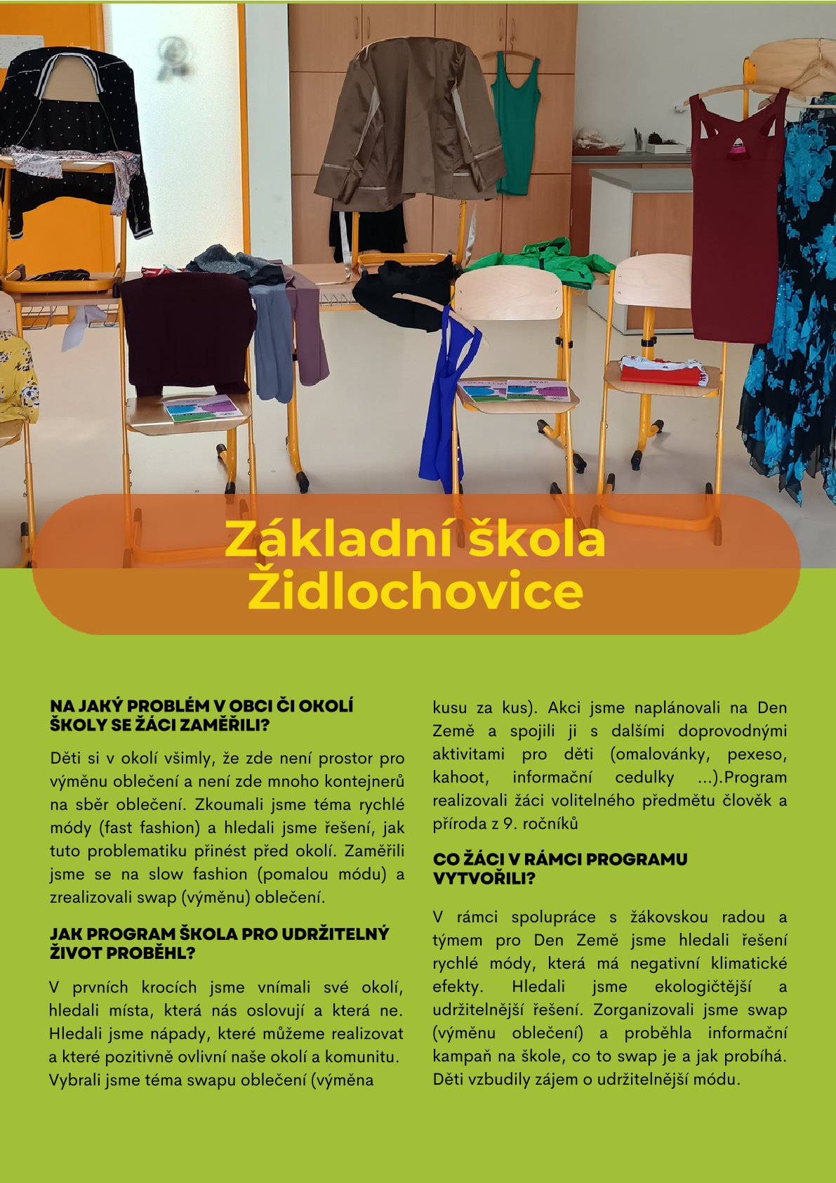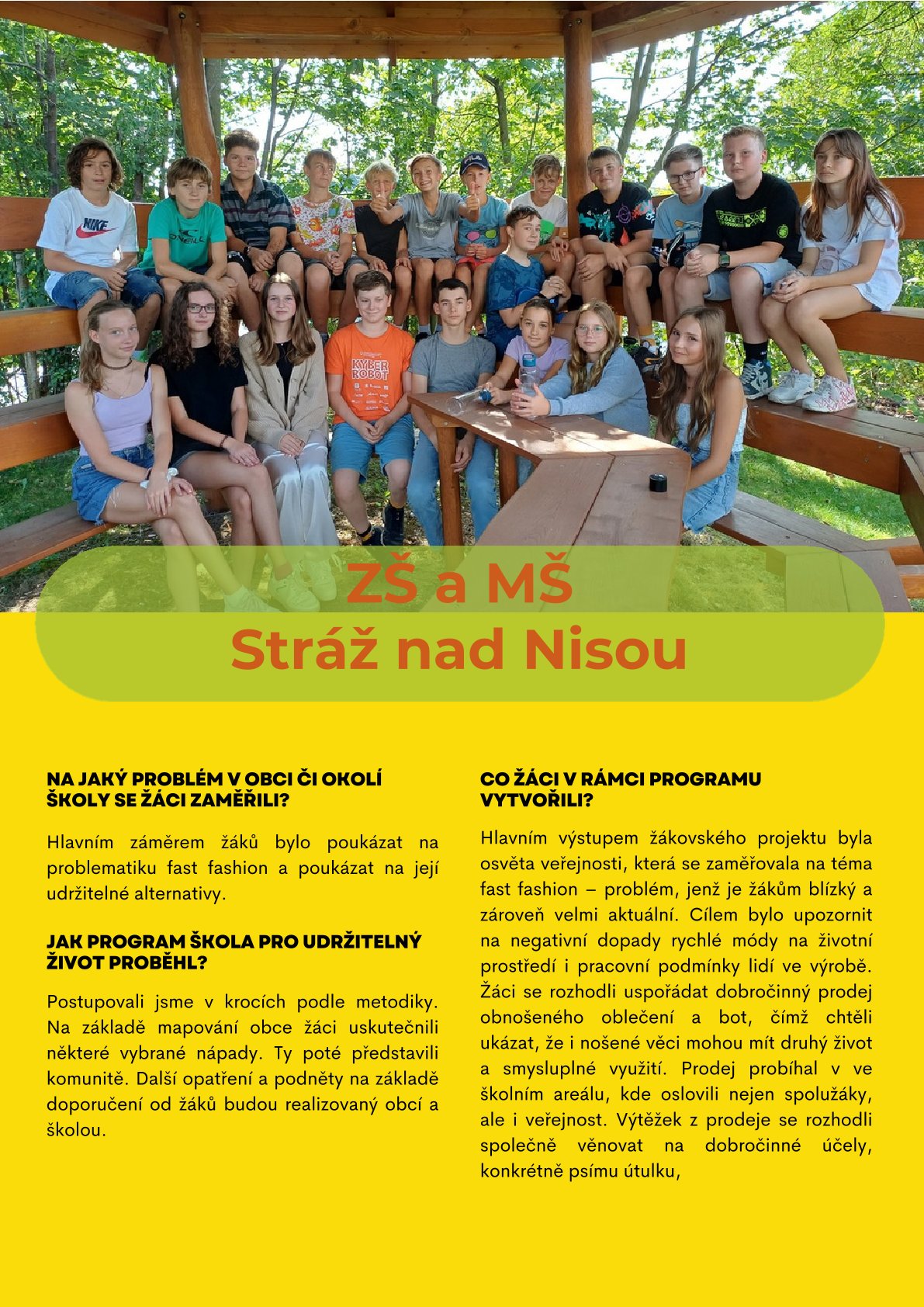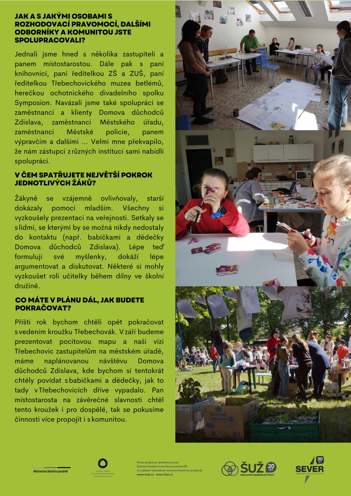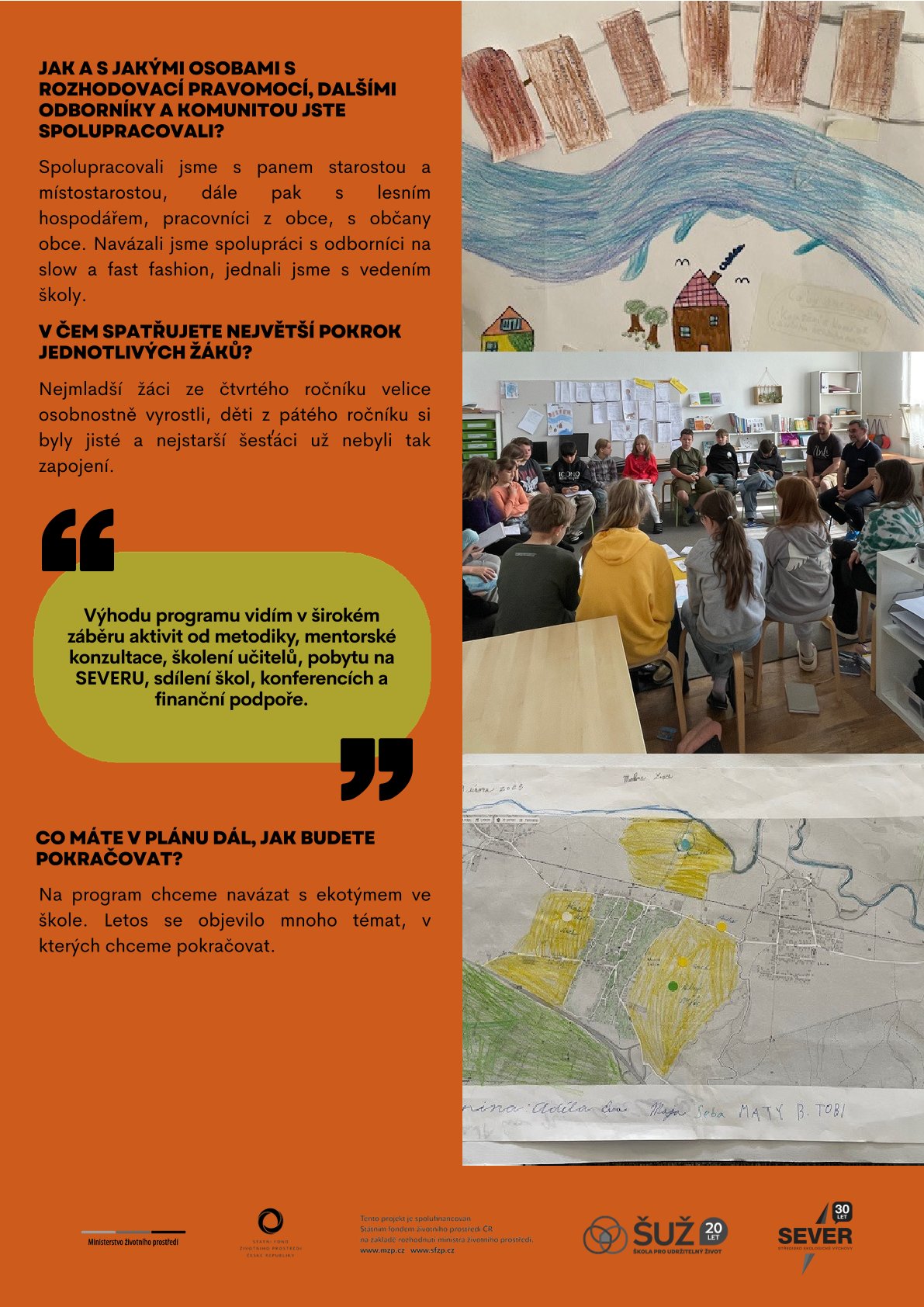 Na jaký problém v obci či okolí školy se žáci zaměřili? Jak program Škola pro udržitelný život v zapojených školách proběhl? Co žáci v rámci programu vytvořili? Nebo v čem spatřují největší pokrok a co plánují do budoucna?