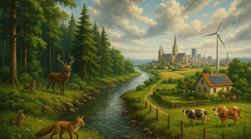 Na začátku hodiny promítněte ilustraci současného světa (příloha 1). V kontrastu vedle sebe je zobrazena krajina bez zásahu člověka a krajina kulturní, člověkem utvářená. Takhle nějak vypadá současnost.